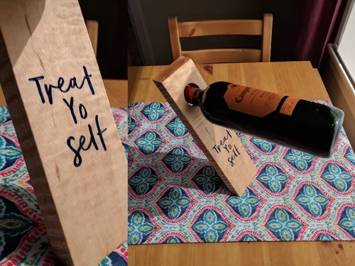 Balancing wine bottle holder. Curly maple engraved on the CNC.