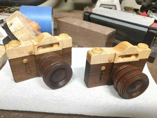Toy cameras made from maple and walnut. The bodies were cut on the CNC and the lenses and knobs turned on the lathe.