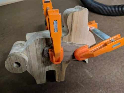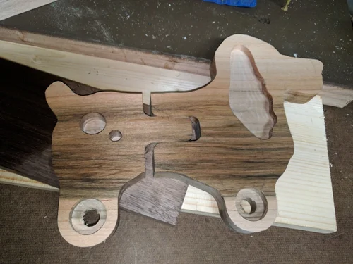 The design is inspired by a toy I discovered online and instantly adored. I used my CNC to cut the rough shape from a single board of maple, and created the inlay for the ears and spots with walnut.